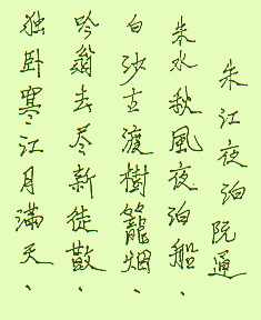 Châu Giang dạ bạc Châu thủy thu phong dạ bạc thuyền, Bạch sa cổ độ thụ lung yên . Ngâm ông khứ tận , tân đồ tán, Độc ngọa hàn giang nguyệt măn thiên . Đêm đậu thuyền ở bến sông Châu Giang Châu Giang thuyền ghé đêm thu , Trắng phơi cát băi khói mù bờ cây . Bạn xa khách cũng chia tay Để riêng sông lạnh trăng đầy bao la . |